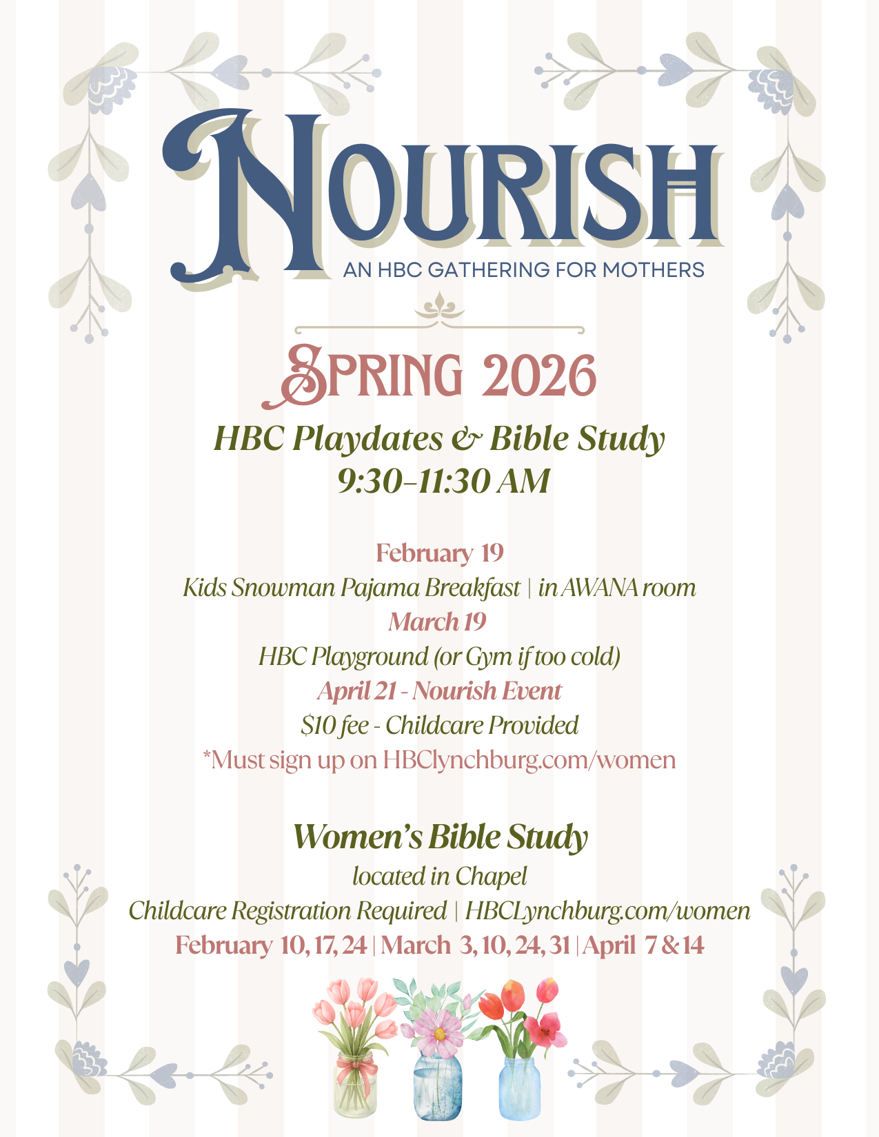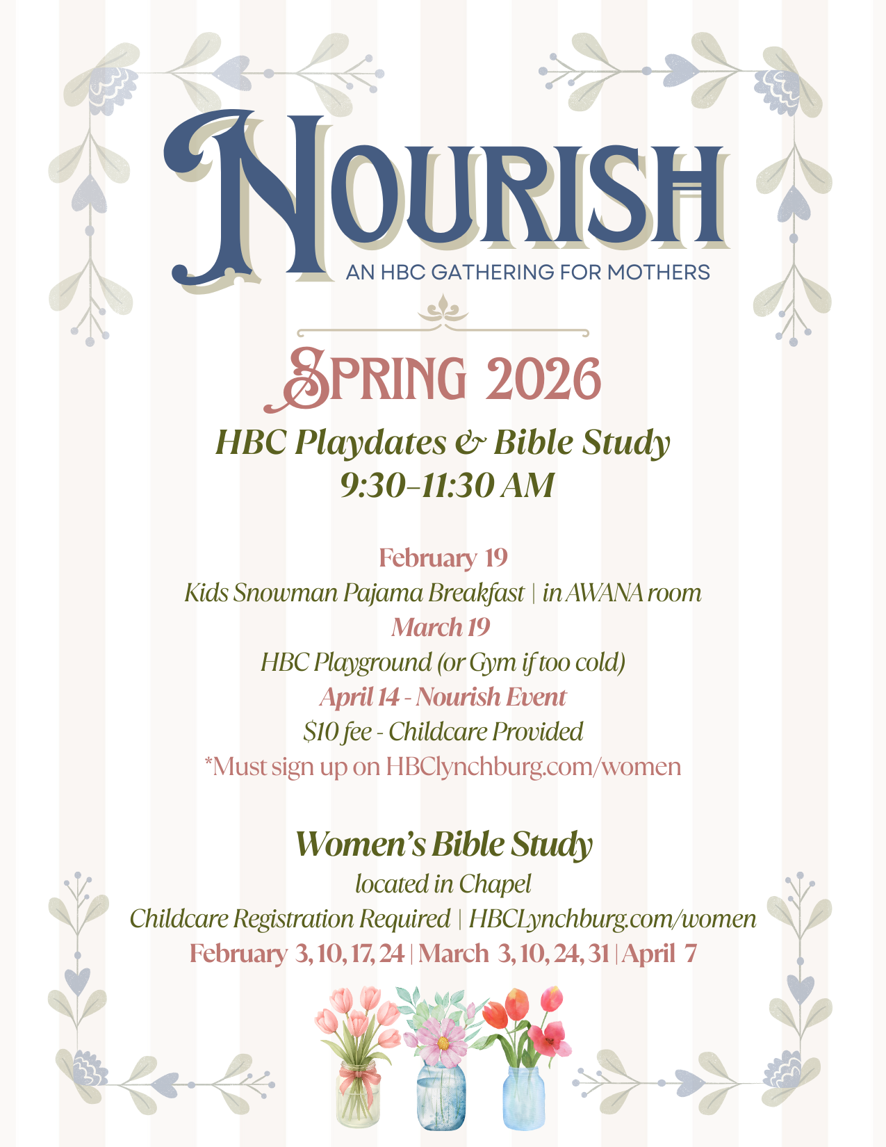 WHAT: Our spring Bible study will be Turn Your Eyes, a study in Psalms published by the Gospel Coalition. Free childcare is offered for the Tuesday morning groups that meet at church but your child must be registered. Click here to register today.